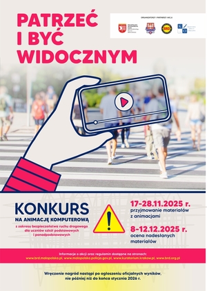 - Konkurs na Animację z zakresu bezpieczeństwa na drodze „Patrzeć i być widocznym” dla uczniów szkół podstawowych oraz ponadpodstawowych Zachęcamy uczniów szkół podstawowych oraz ponadpodstawowych do wzięcia udziału w Konkursie na Animację „Patrzeć i być widocznym”.