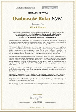 Mł. asp. Michał Książek - Dzielnicowy z Posterunku Policji w Książu Wielkim Komendy Powiatowej Policji w Miechowie uzyskał nominację Kapituły Redakcji "Gazety Krakowskiej" i "Dziennika Polskiego" do prestiżowego tytułu Osobowość Roku 2025 w kategorii Działalność Społeczna i Charytatywna.