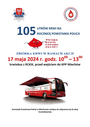 - 105 LITRÓW KRWI NA 105 ROCZNICĘ POWSTANIA POLICJI” W połowie stycznia br., rozpoczęła się akcja krwiodawstwa „105 litrów krwi na 105 rocznicę powstania Policji”. Akcja została zainicjowana przez Komendę Wojewódzką Policji w Krakowie, w związku z obchodzoną w tym roku 105 rocznicą powstania Policji. Do akcji może dołączyć każdy krwiodawca. Oddając krew należy podać numer akcji - K105.